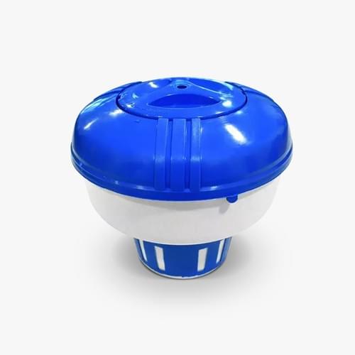 Boya dosificadora de cloro Vulcano modelo Exo, para pastillas de 50 y 200 g, con ojal para limitar su movilidad dentro del espejo de agua. La boya dosificadora flota sobre la superficie de la piscina conteniendo pastillas de cloro de disolución lenta o triple acción que, al al entrar en contacto con el agua, se disuelven lentamente.